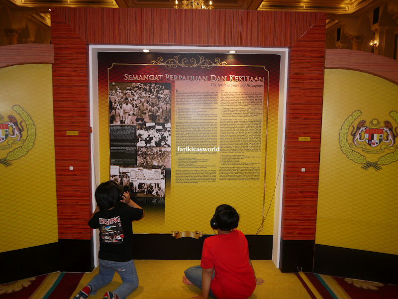 Anak-anak saya seperti biasa, di mana-mana akan bermain dan membuat onar. Mula2 saya sangat risau nak bawak mereka pasal takot mereka pecahkan barang2 tp bila sampai sana, alhamdulillah, semuanya disimpan dalam peti kaca. Kalau tak, peristiwa di Beijing bakal berulang pulak kat istana nanti... Budak2 ni seronok pulak dengar dokumentari..W/pon dokumentari tu cuma orang bercakap-cakap, tp mereka mengganggapnye mcm org rap (tanggapan sayalah), pasal saya nampak dak Farah begitu seronok mengangguk2 dan geleng2 kepala mcm syiok sangat dengar lagu... Sehingga saya pon terpedaya dan tertarik nak dengar.."Meh sini mama dengar lagu apa nih.?" Farah pon bagi... Rupa2nya.."Kesultanan Melayu merupakan...bla...bla...bla..." Huh, tertipu dngn budak nih... Ingatkan lagu tradisional ke hape... Jom kite tengok aksi perak dak Farah & Faris kat sini.